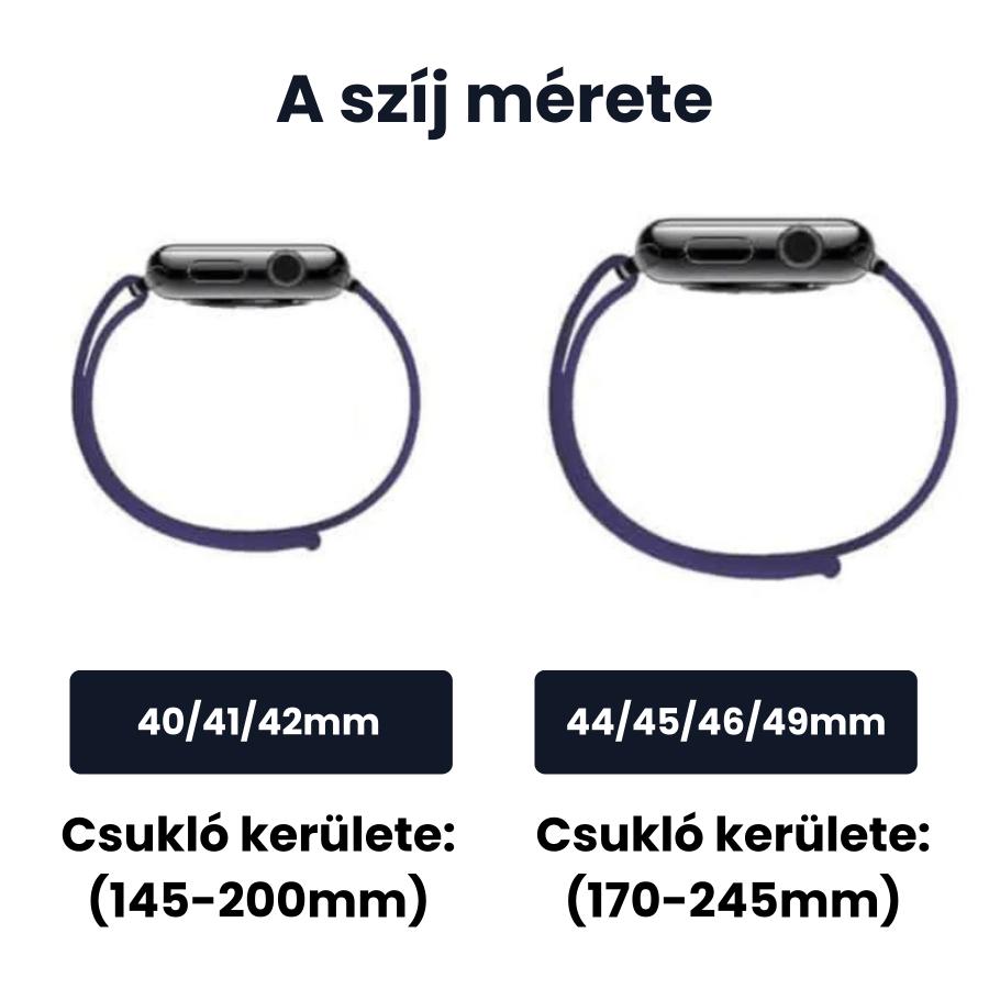 Az Apple Watch méretét az óra hátoldalán találod (pl. 38/40/41 mm vagy 42/44/45/49 mm). Weboldalunkon minden szíj mellett feltüntetjük, melyik méretű órához illik.